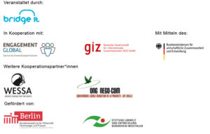 Die Countdown 2030 Konferenz wird veranstaltet durch bridge-it! e.V. in Kooperation mit Engagement Global und in Kooperation mit der Deutschen Gesellschaft für Internationalen Zusammenarbeit (GIZ), gefördert durch das Bundesministerium für wirtschaftliche Zusammenarbeit und Entwicklung, mit Haushaltsmitteln des Landes Berlin – Landesstelle für Entwicklungszusammenarbeit -, von der BGAG-Stiftung Walter Hesselbach und von der Stiftung Umwelt und Entwicklung Nordrhein-Westfalen.